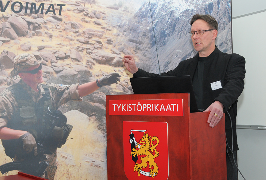 Porin Prikaatin operaatiokeskuksesta paikalle saapunut tilannevalvoja Keijo Keskinen (kuvassa) kertoi tällä hetkellä meneillä olevien operaatioiden kuulumisista, itse operaatiokeskuksen työstä tilannetietoisuuden ylläpitämisessä ja YK-operaatiosta Liberiassa.